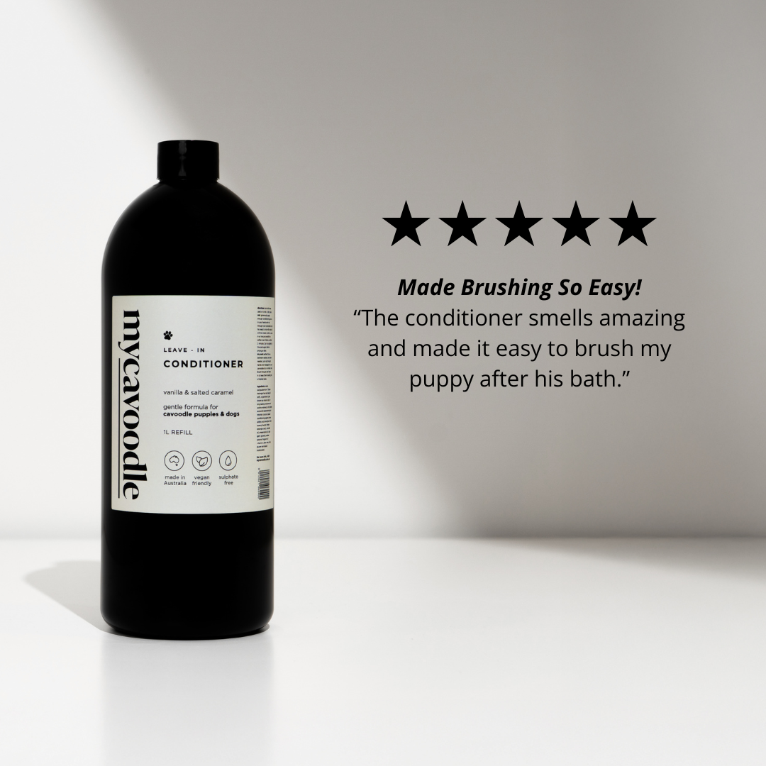 If you love our 330ml Vanilla and Salted Caramel Leave-in Conditioner for your cavoodle you are going to love our 1L refills for those reusable 330ml aluminium bottles.
